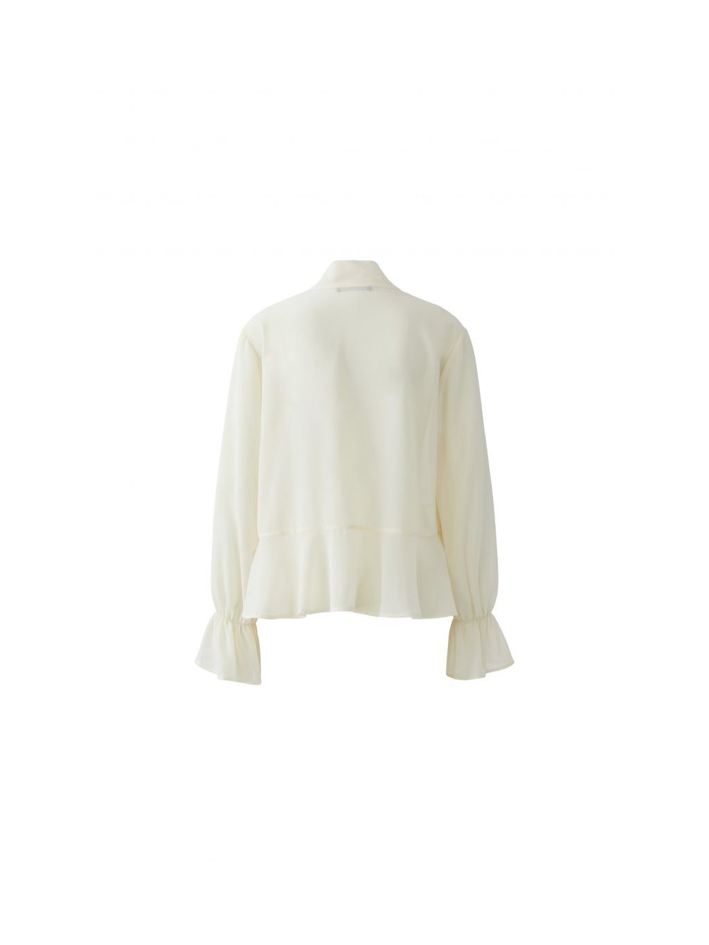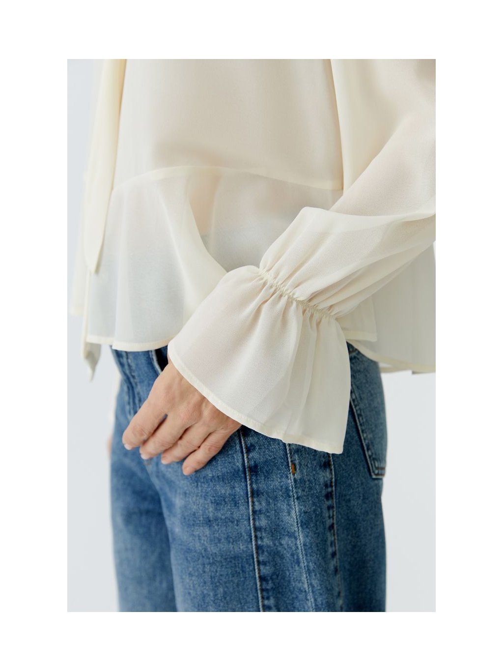 Halenka je vyrobena z tenké a nepružné tkaniny, výstřih do V s vázáním, dlouhé nabírané rukávy.