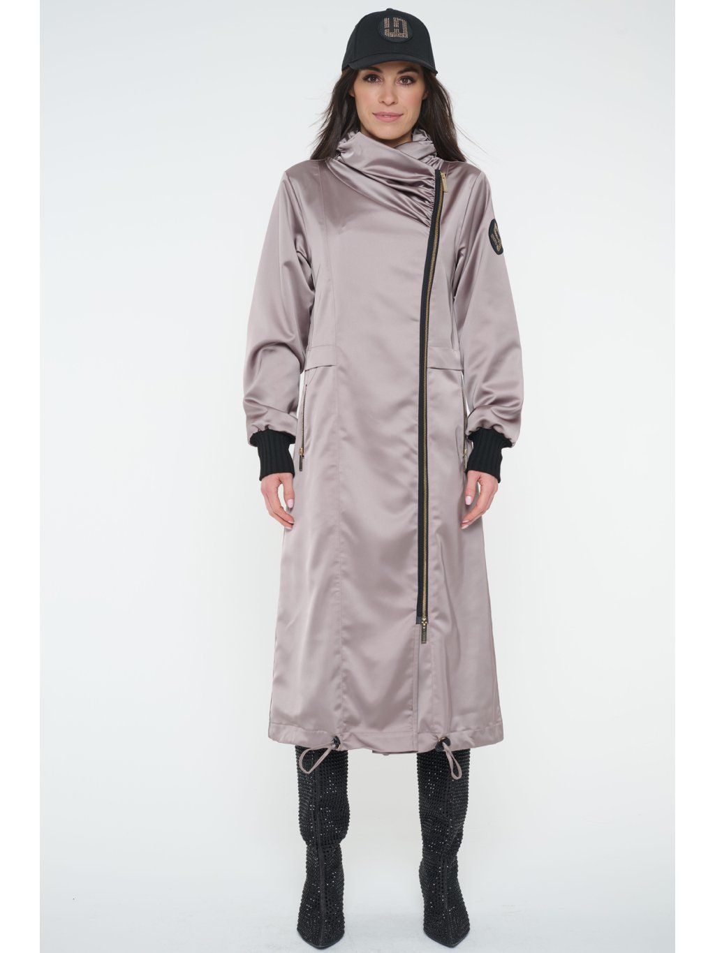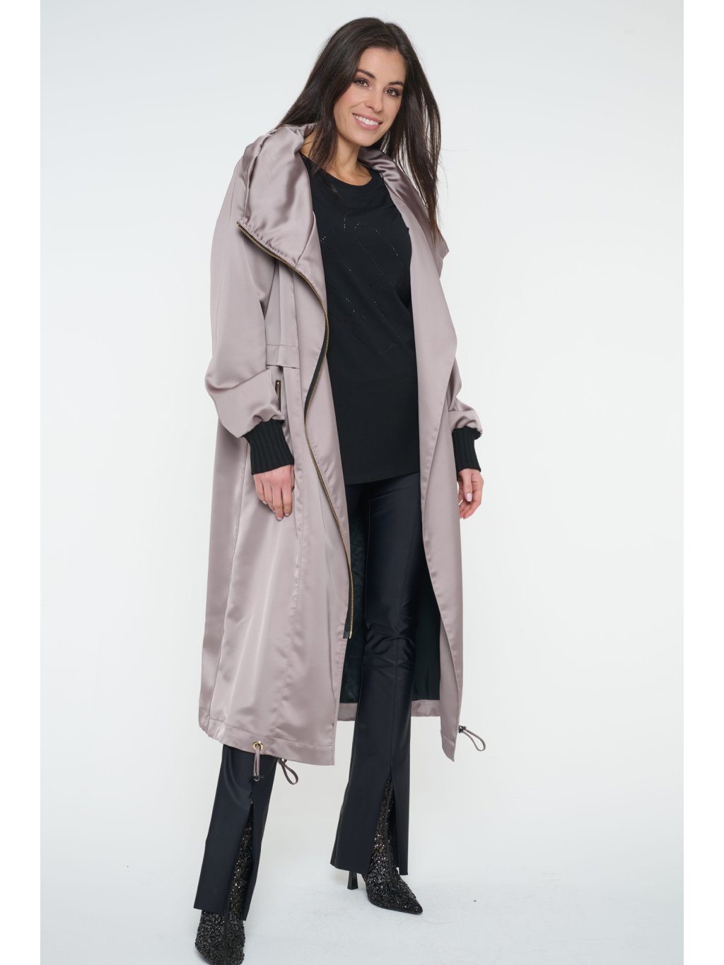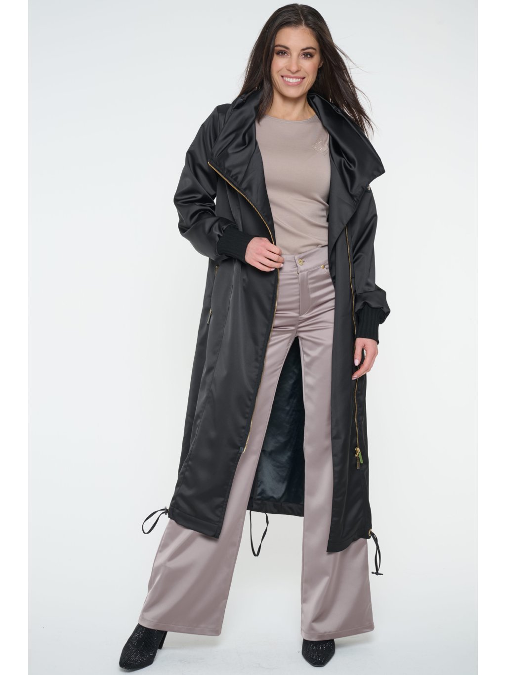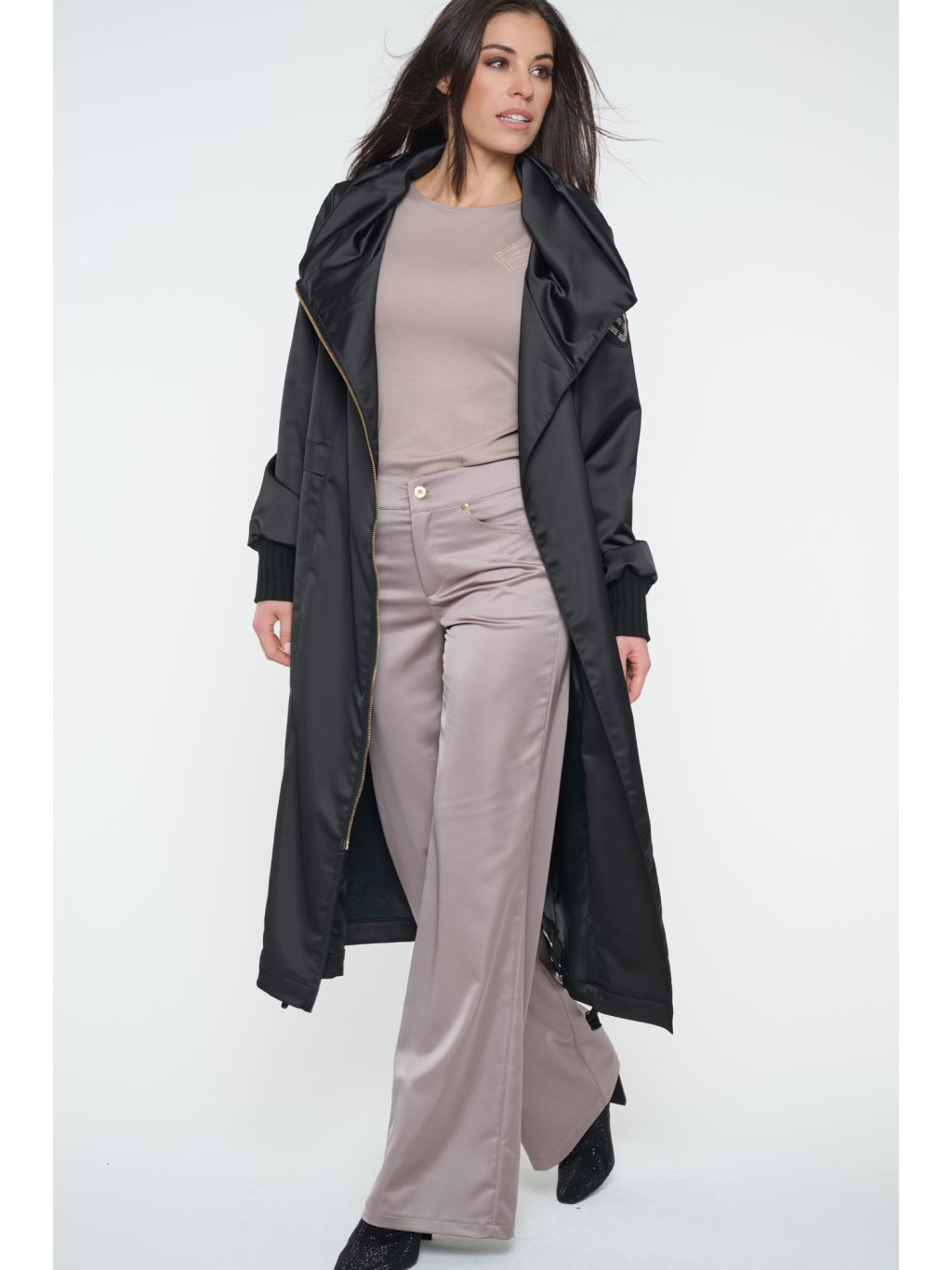 Dlouhý jarní kabát s logem INFINITE ze zlatých krystalů Preciosa. Úpletové manžety.