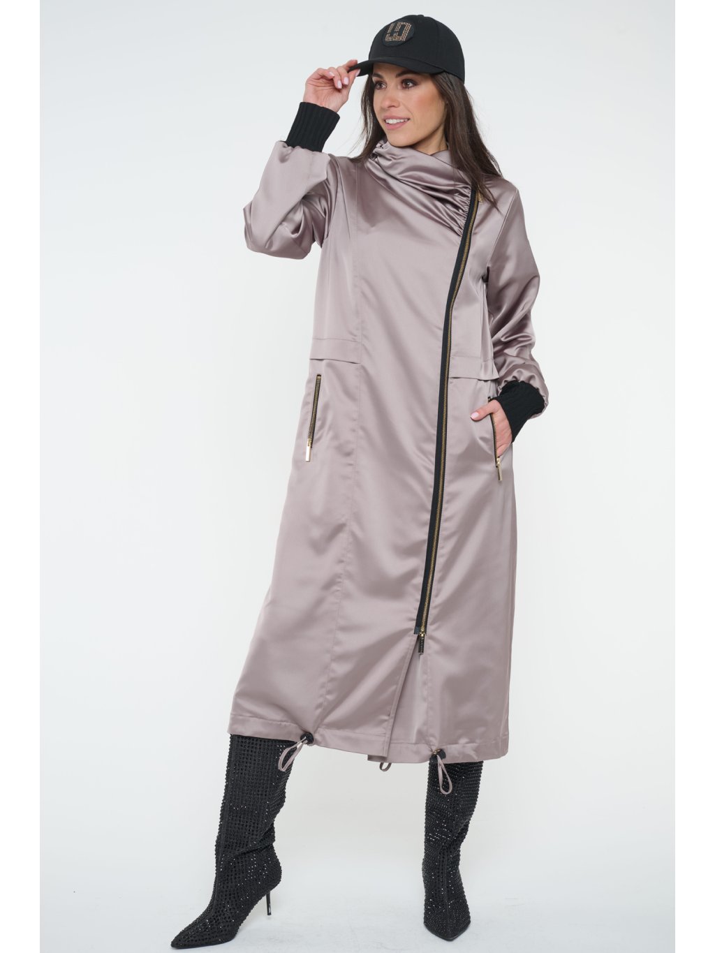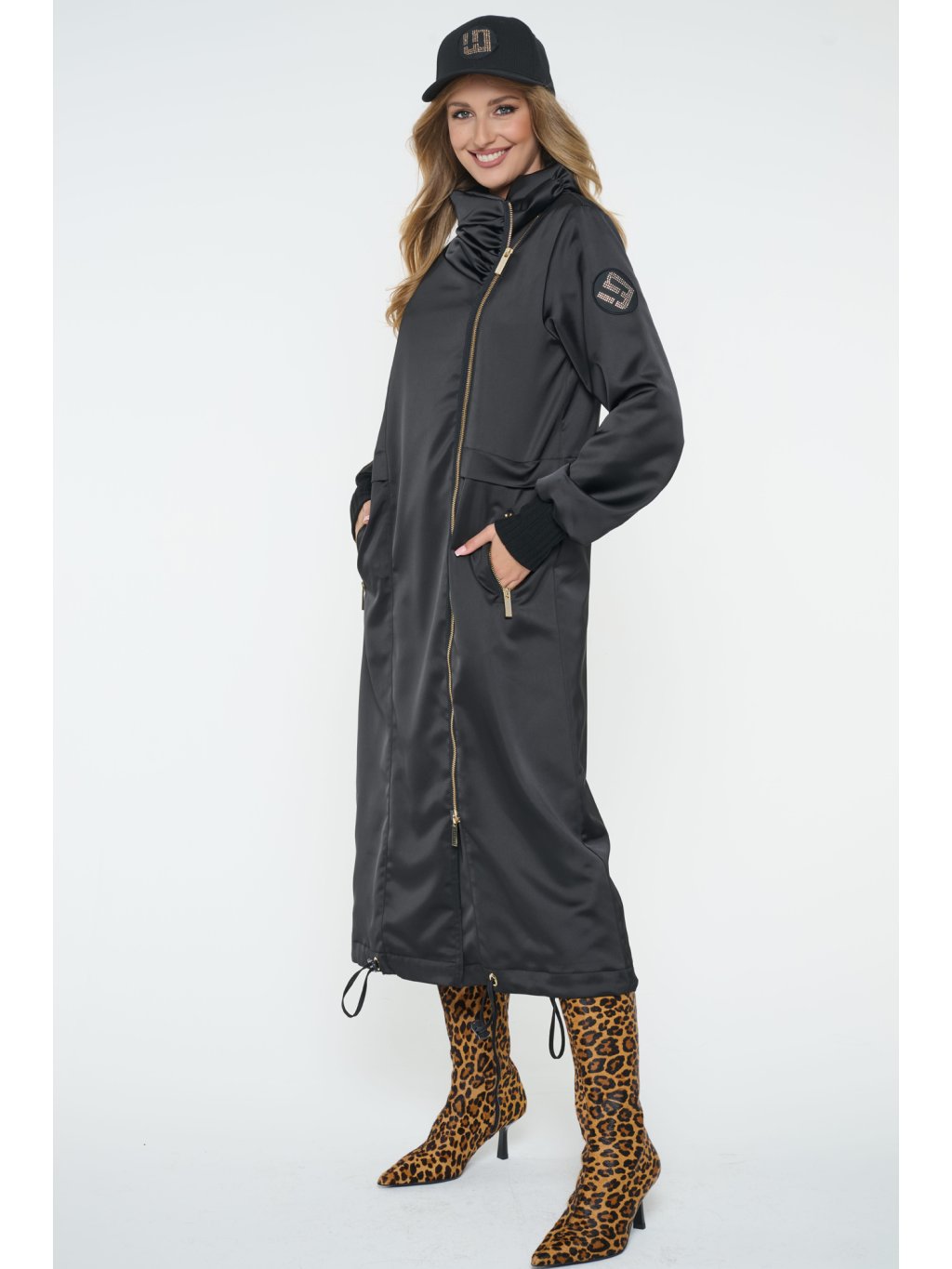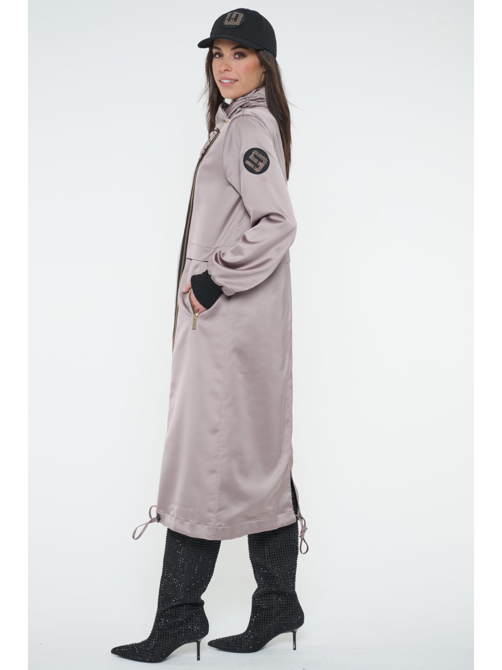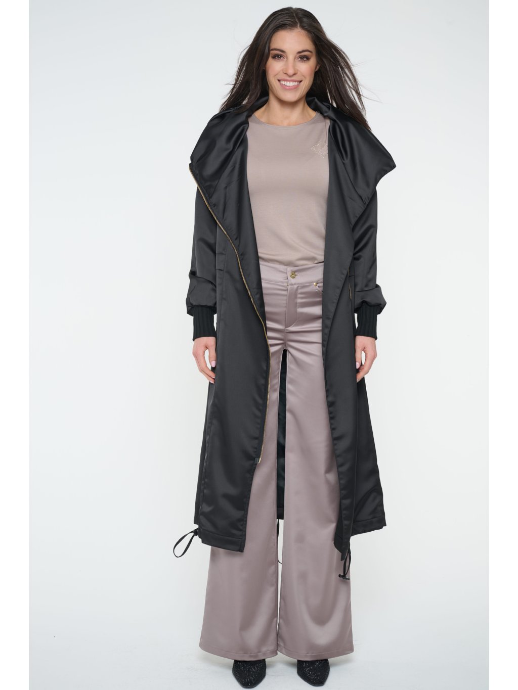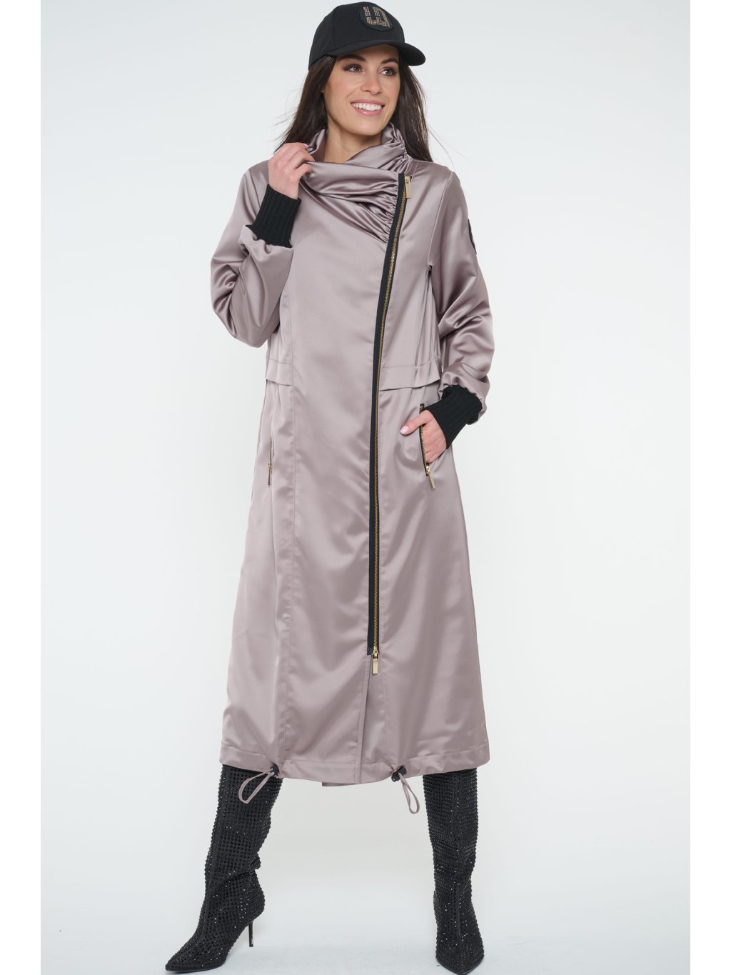 Dlouhý jarní kabát s logem INFINITE ze zlatých krystalů Preciosa. Úpletové manžety.