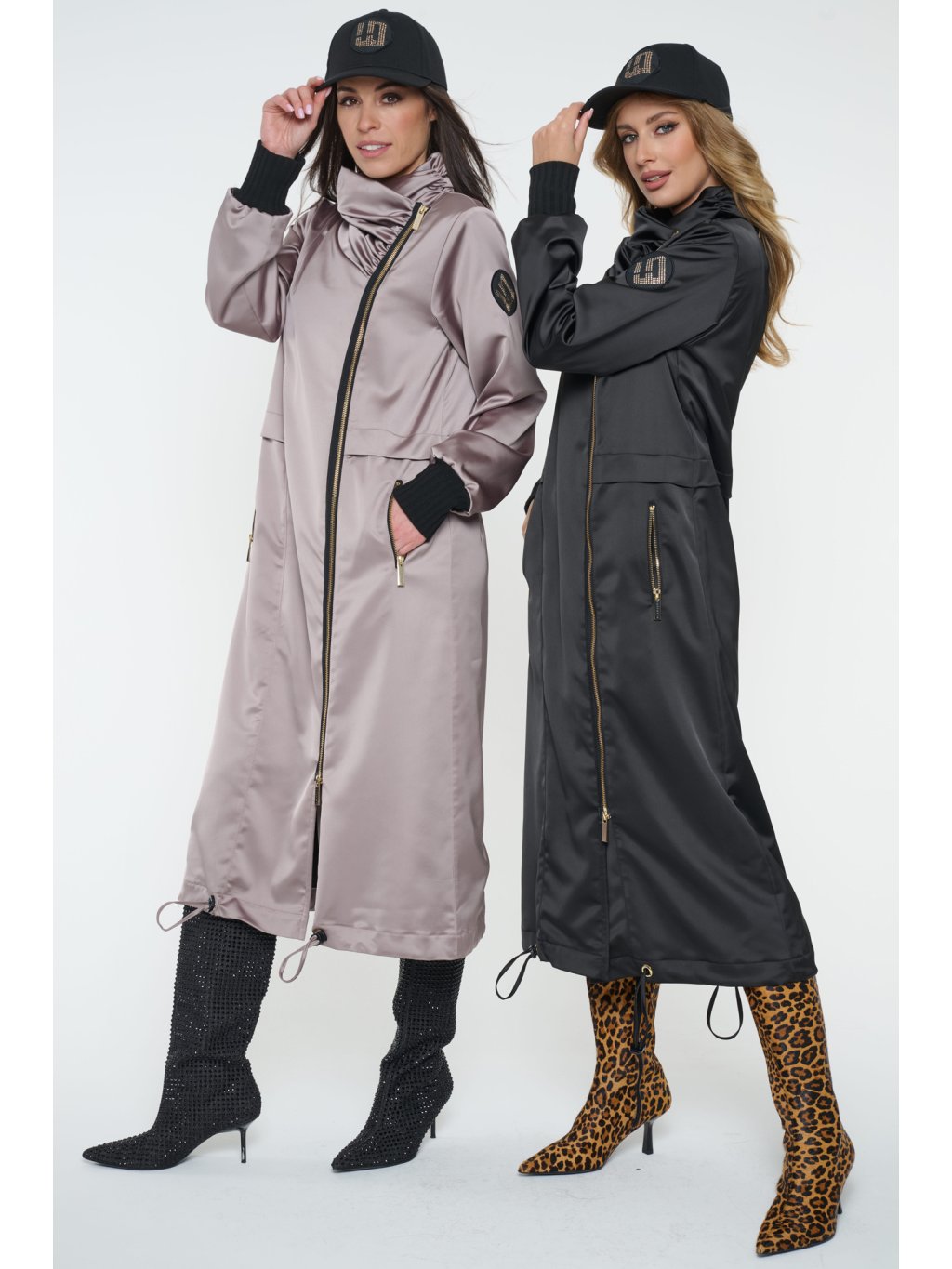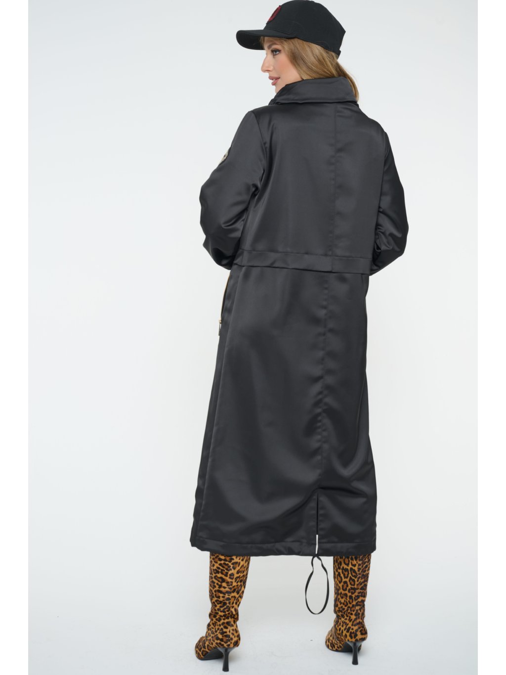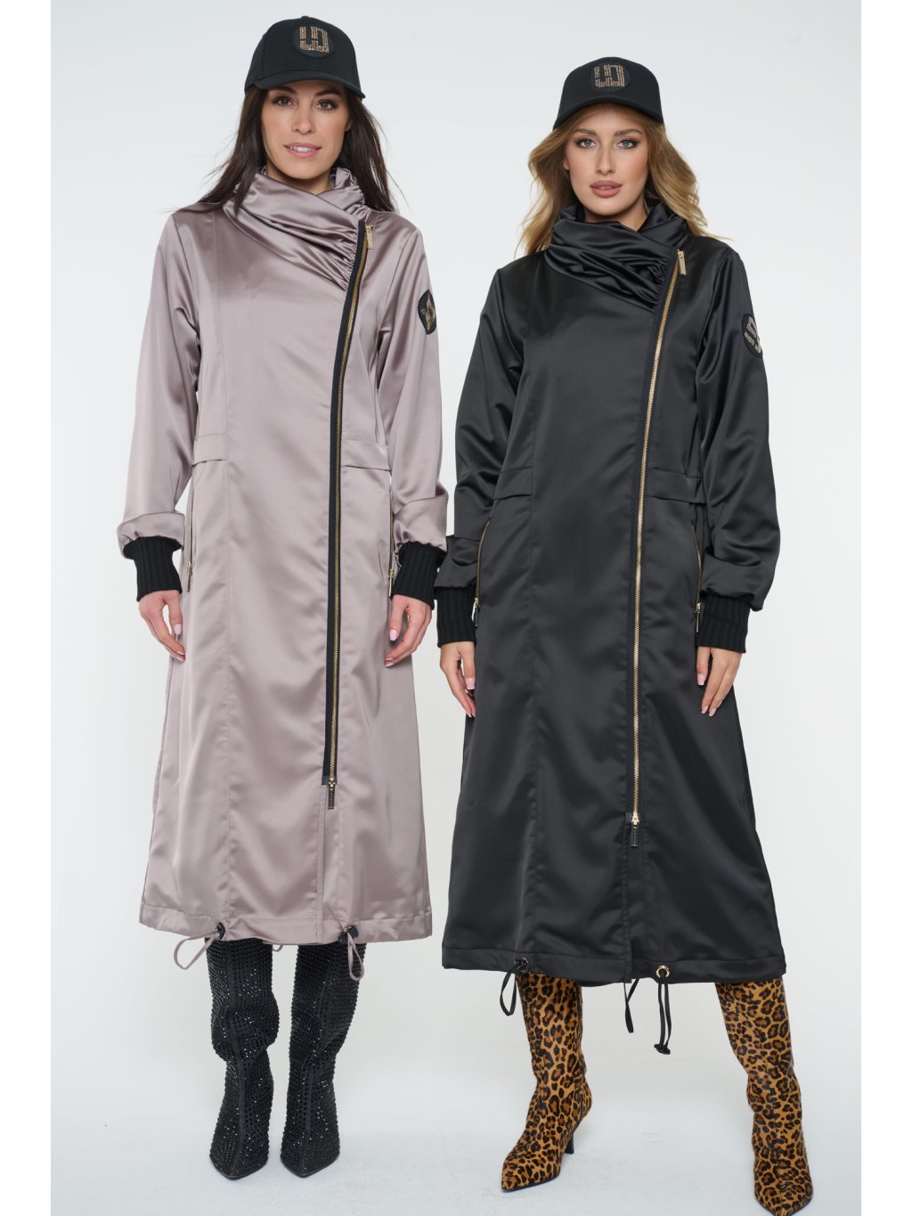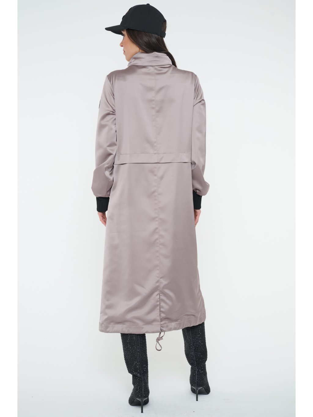 Dlouhý jarní kabát s logem INFINITE ze zlatých krystalů Preciosa. Úpletové manžety.