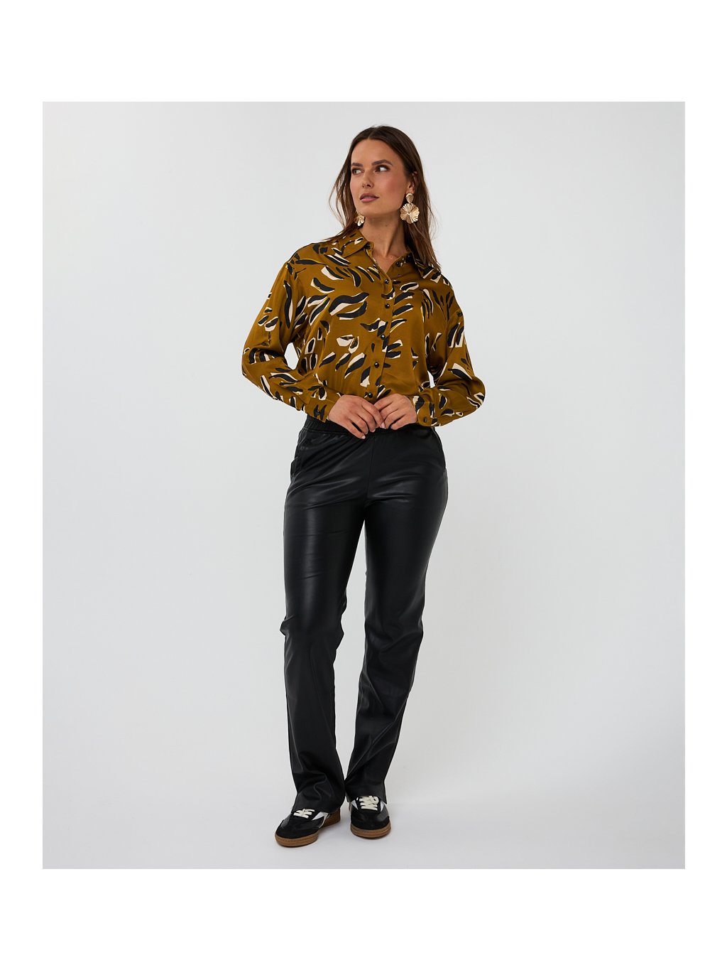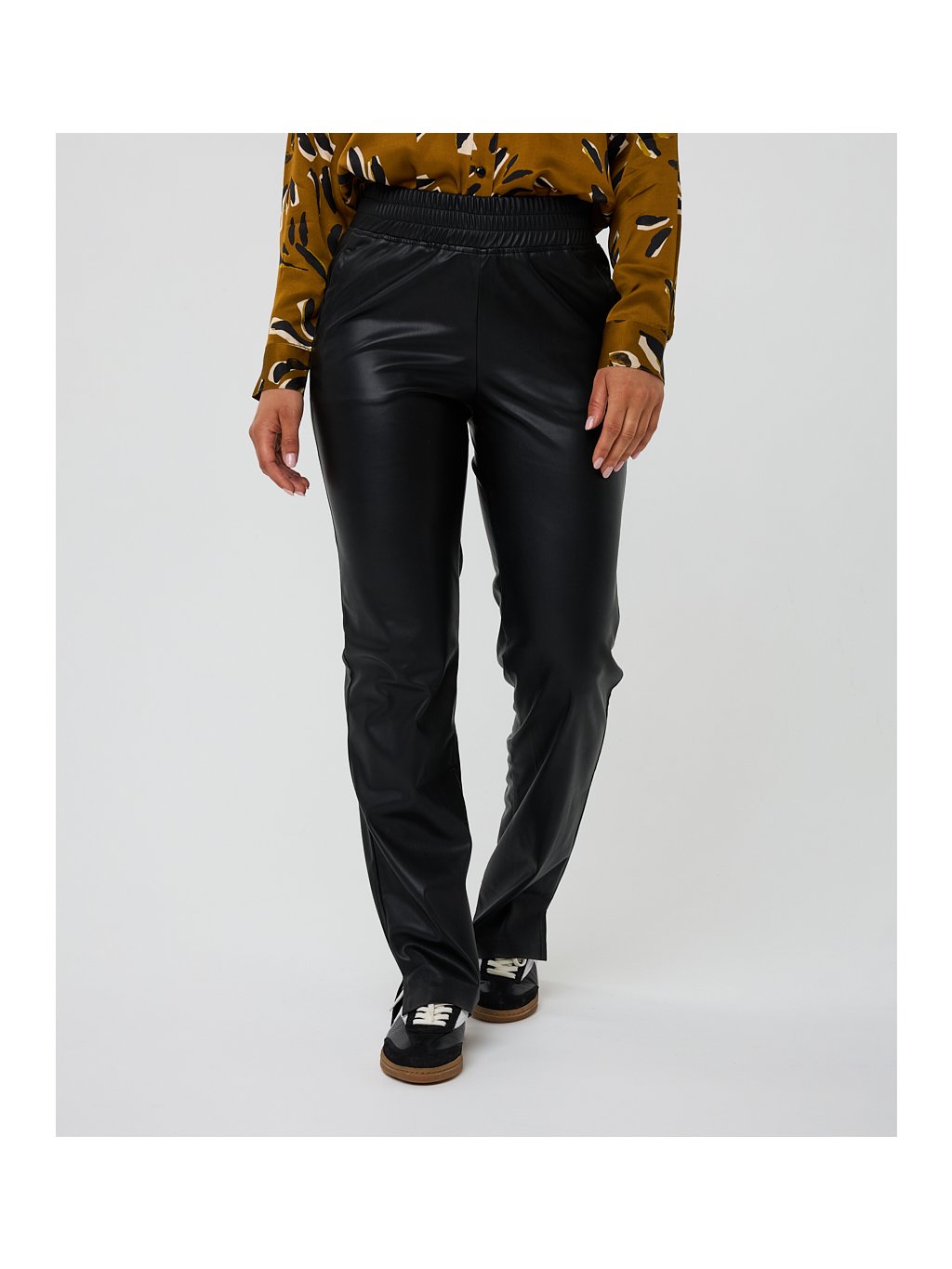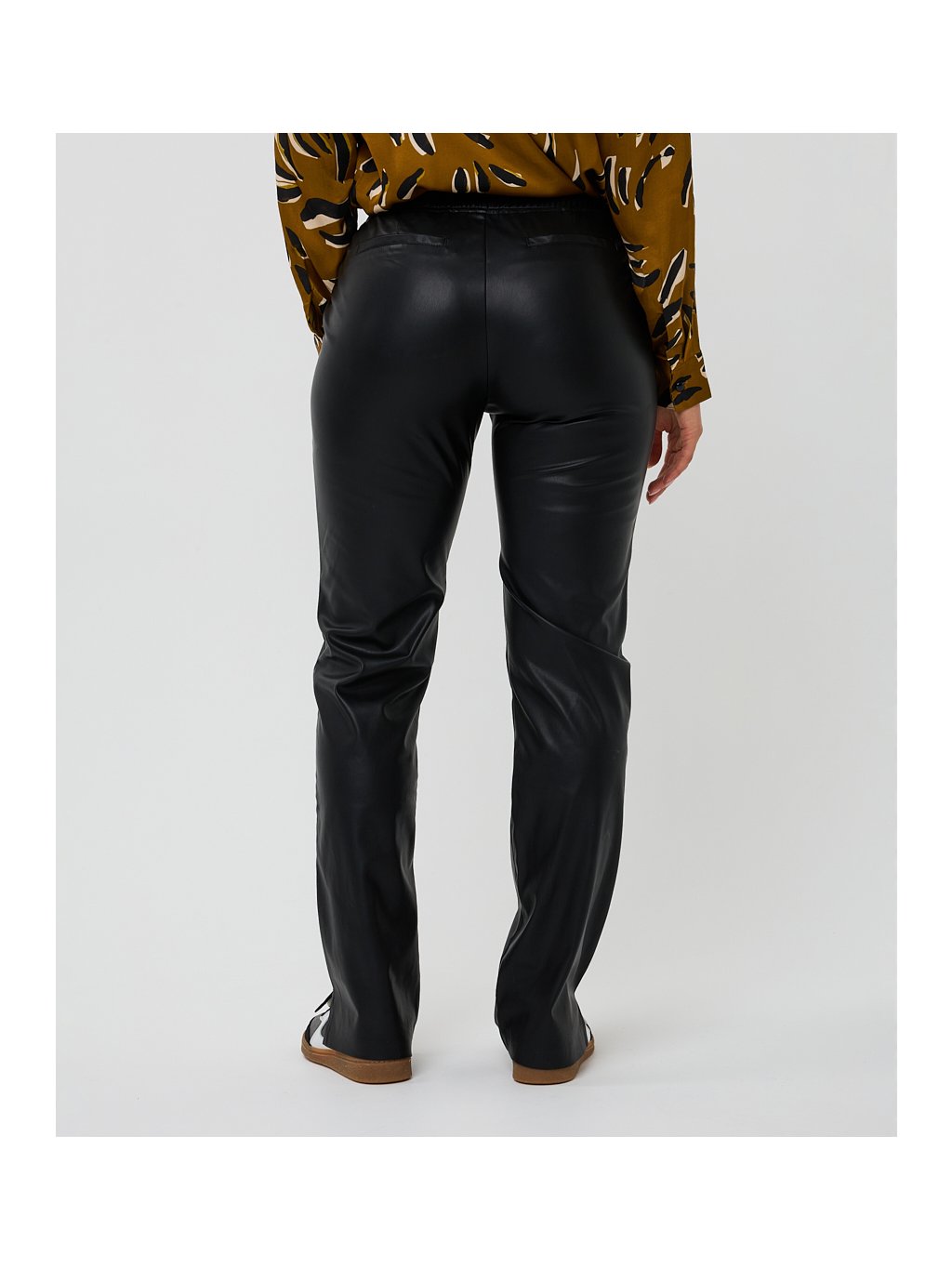 Příjemné koženkové kalhoty v pase na gumu, boční lištové kapsy. Rovný střih s rozparkem.