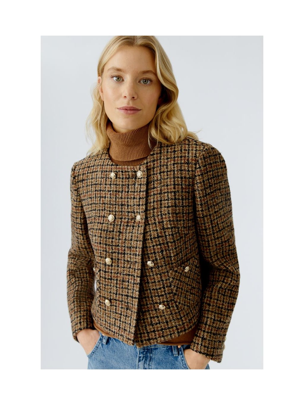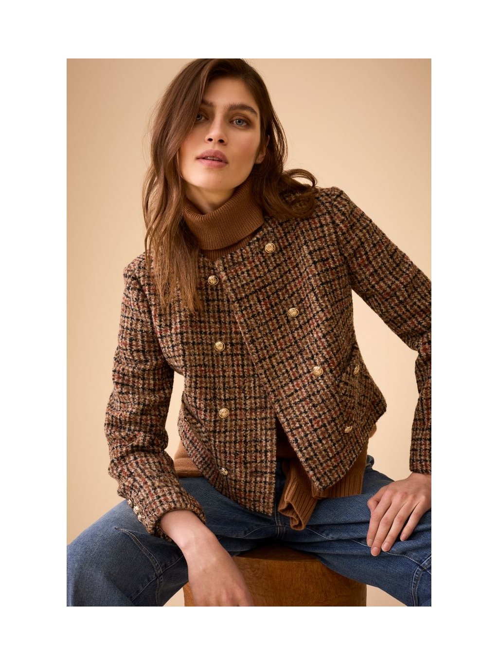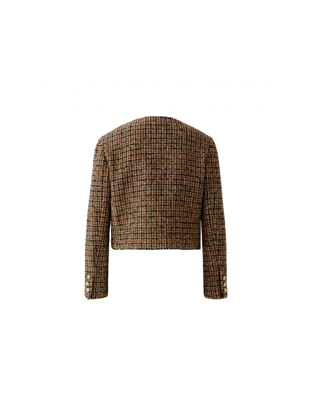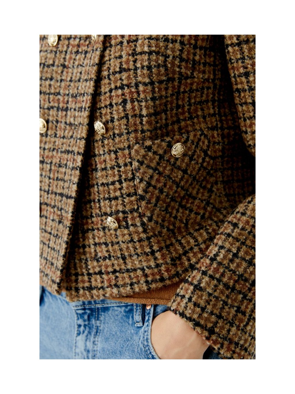 Tato kostkovaná bunda z vlněné směsi je všestrannou volbou pro stylový vzhled. Kulatý výstřih a rovná silueta ji činí nadčasovou, zatímco dvojitá řada zlatých knoflíků s potiskem erbu a kapsy na knoflíky dodávají výrazný detail.