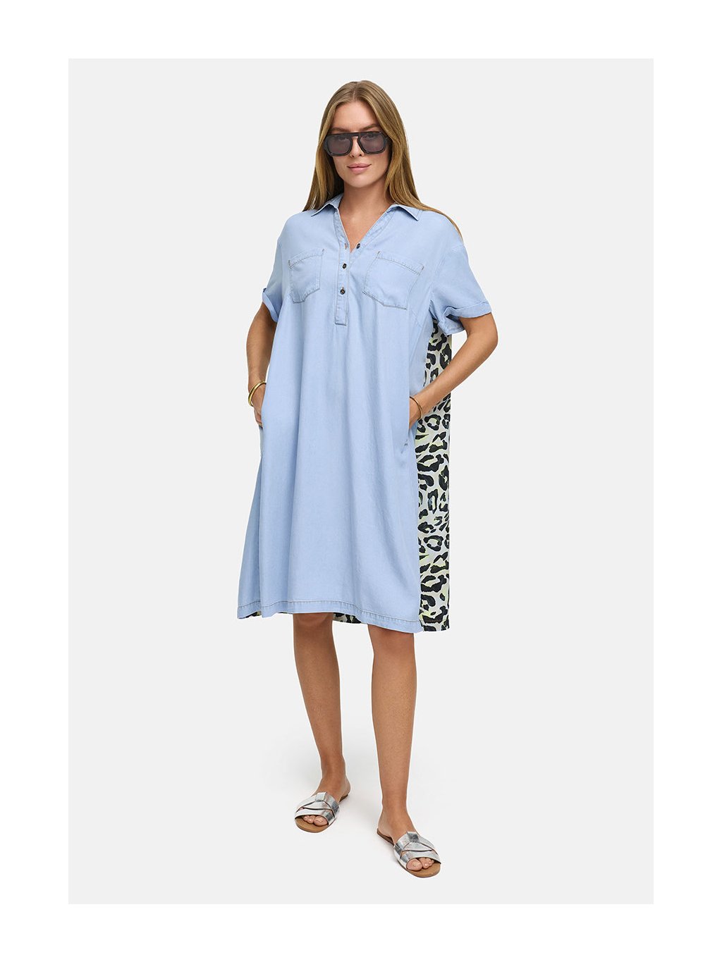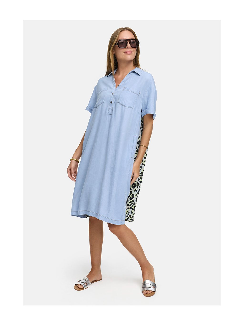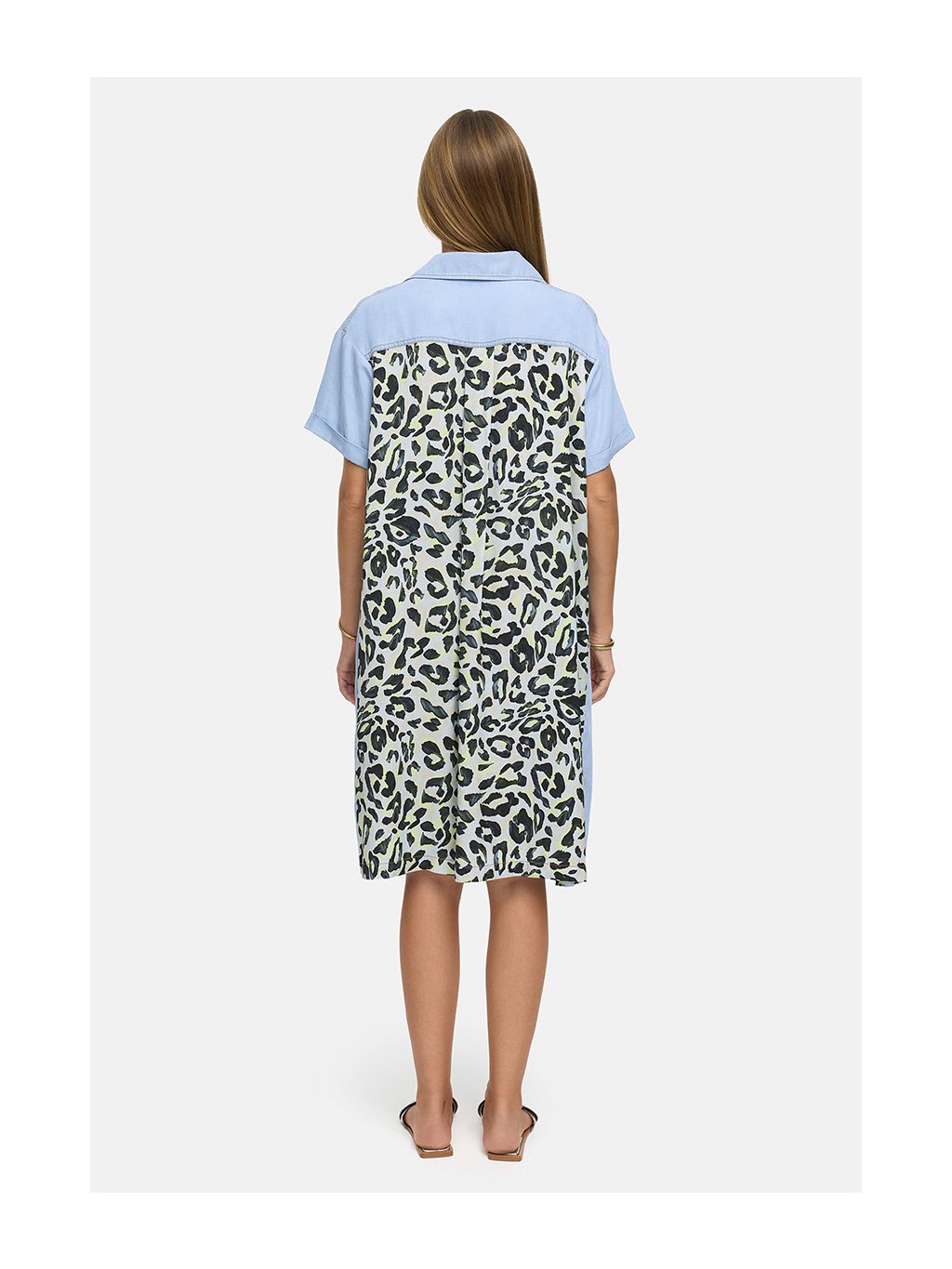 Šaty z měkkého lyocellu CATNOIR, krátký rukáv, límeček a výstřih na knoflíky. Zadní část šatů leopardí vzor.