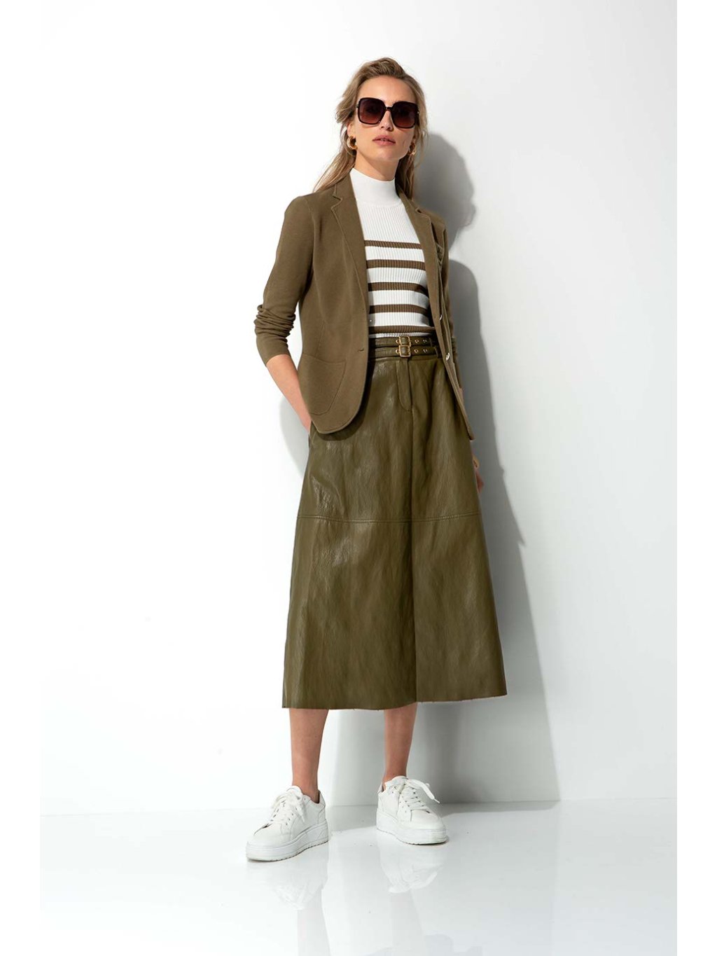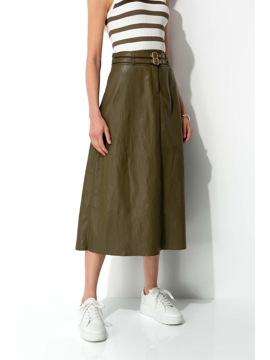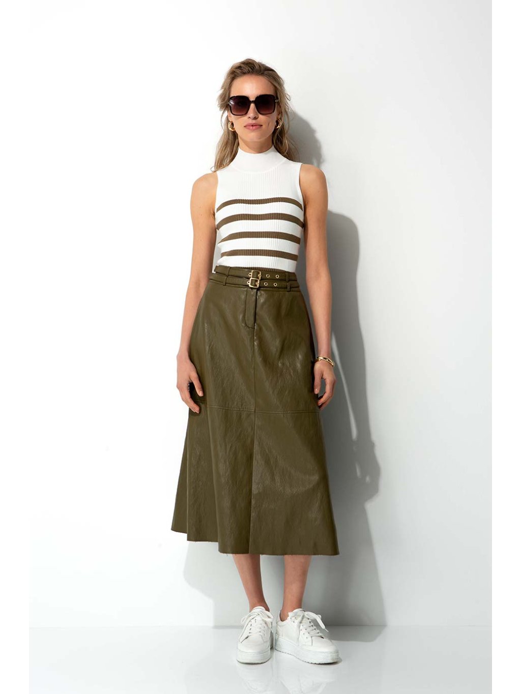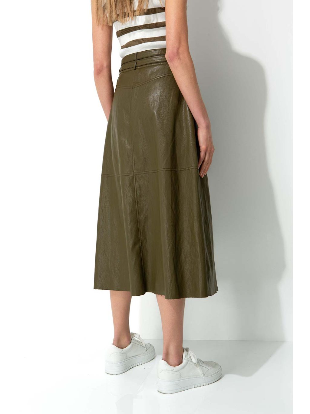 Sukně CATNOIR v khaki barvě. Stři do A, v pase pásečky. Přijemná měkká eco kůže.