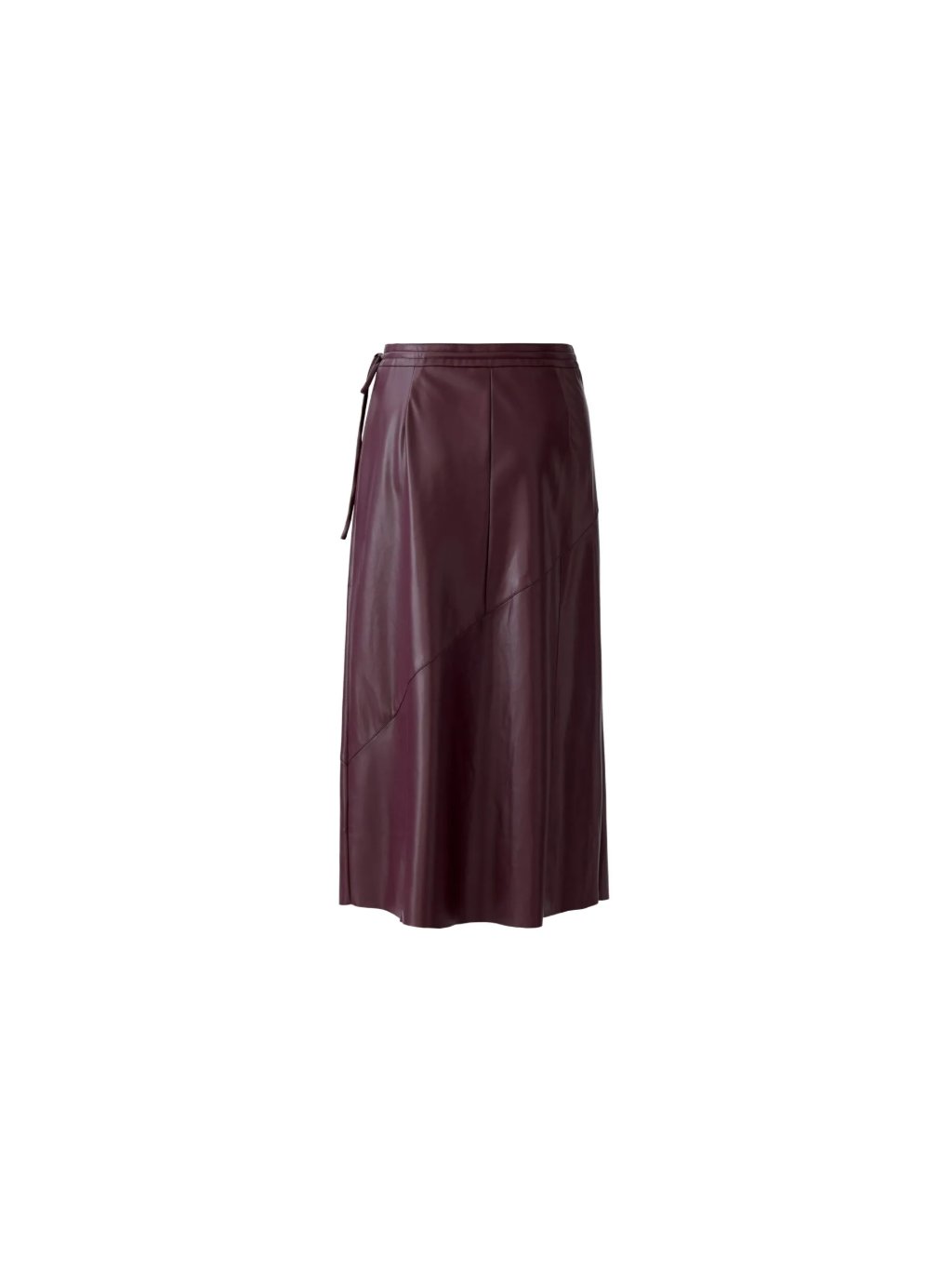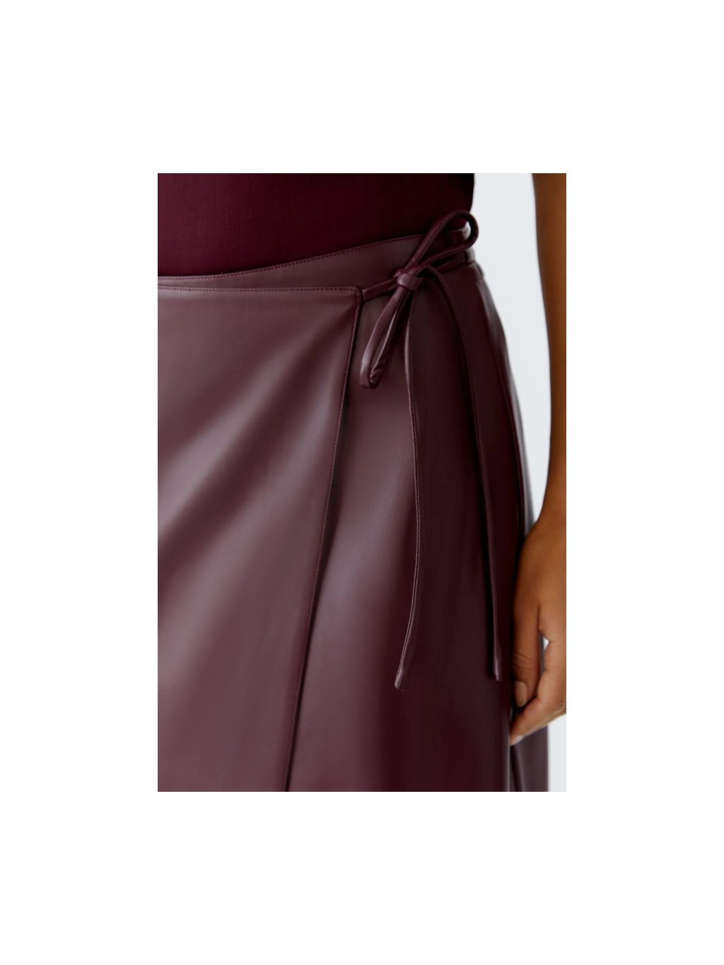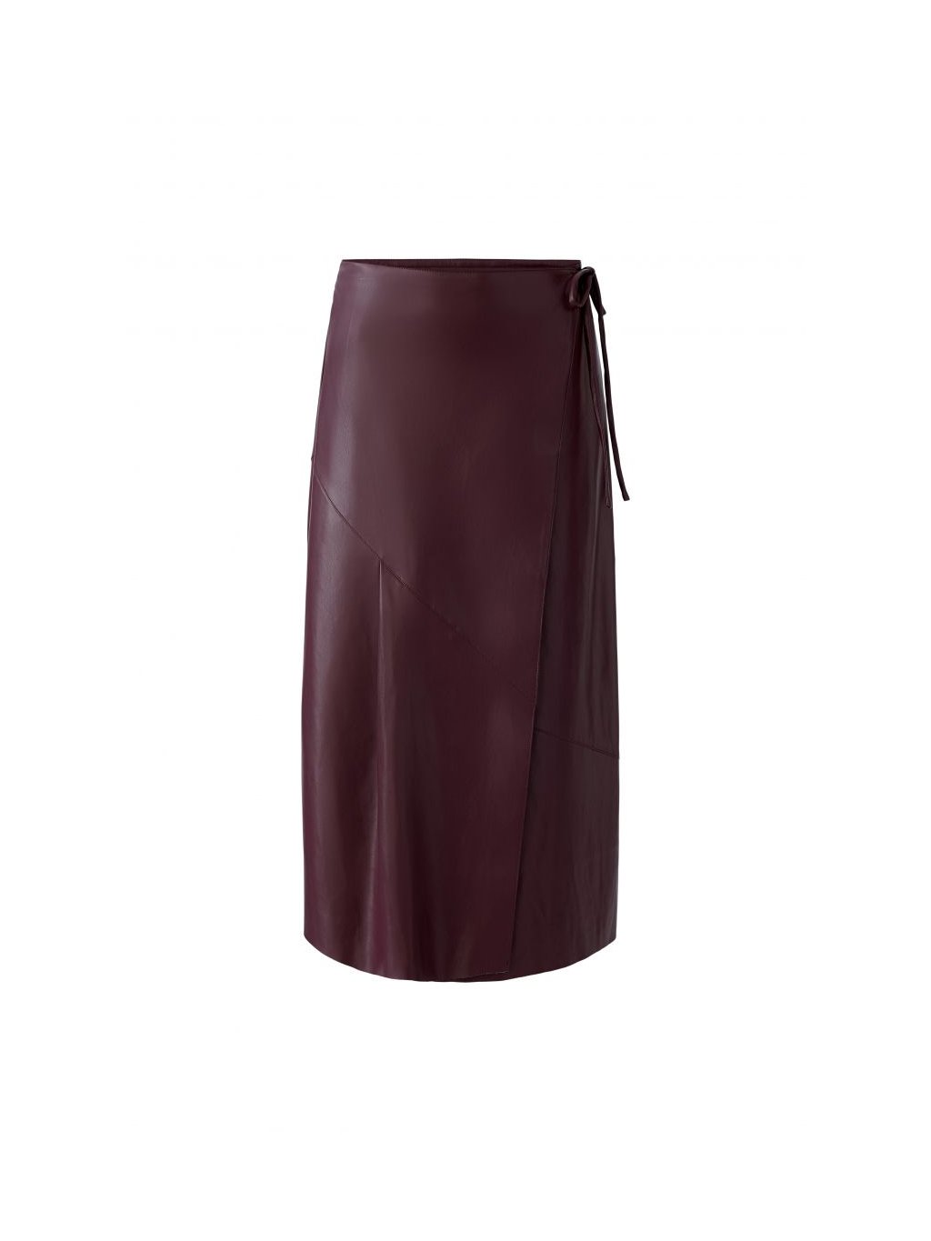 Sukně OUI z imitace kůže. Střih do A, zavinovací s vázáním umožňující regulaci.