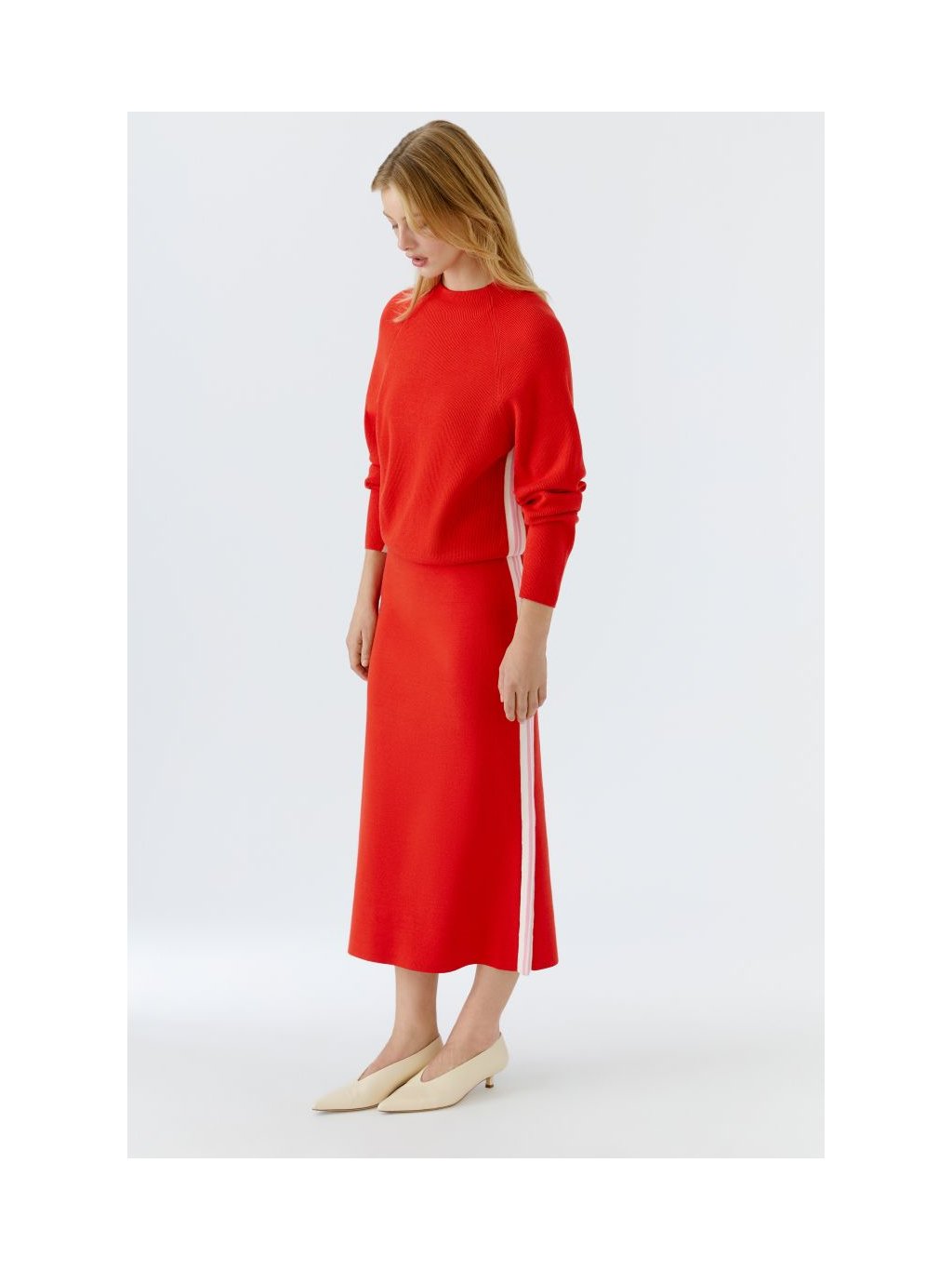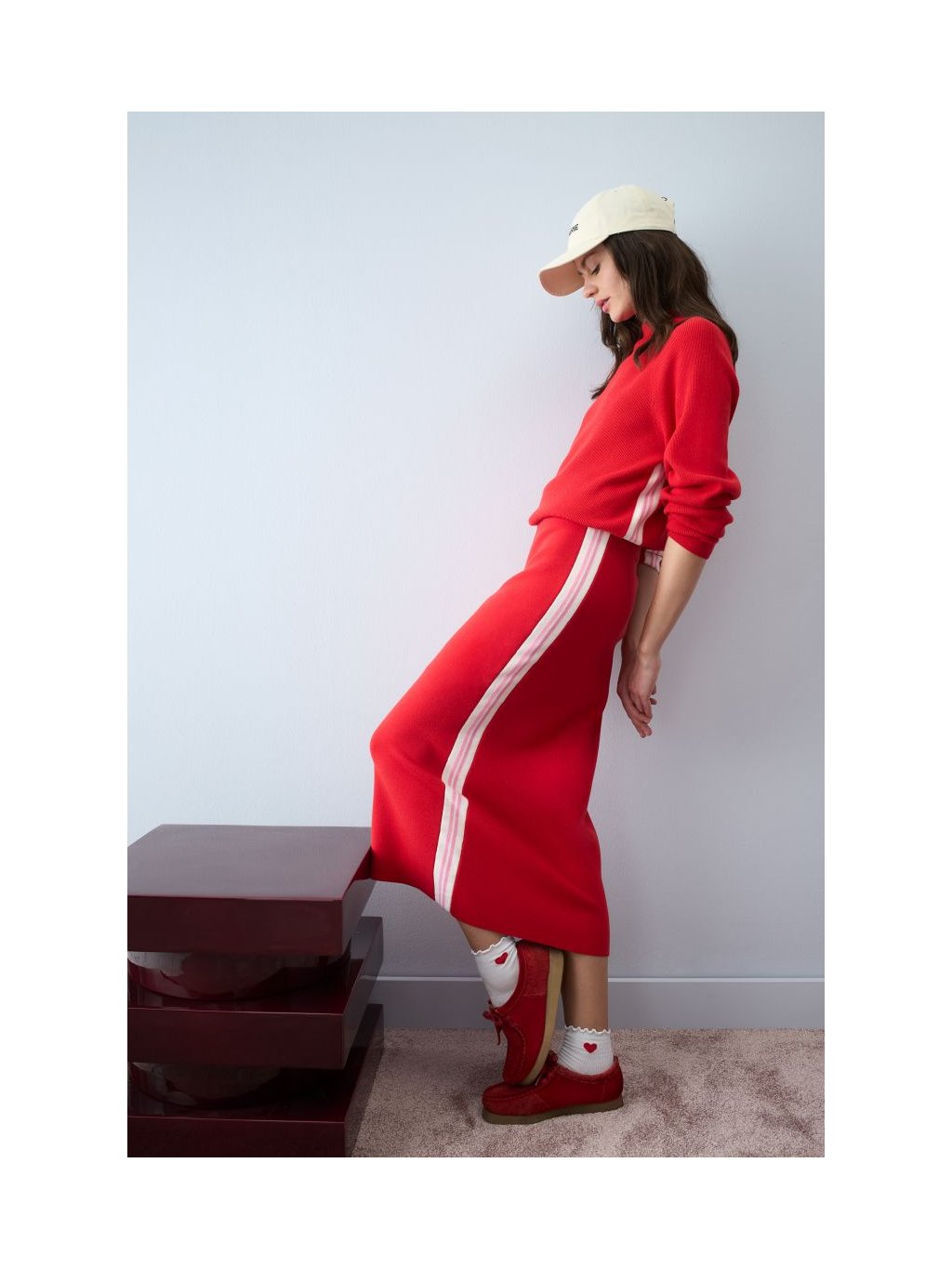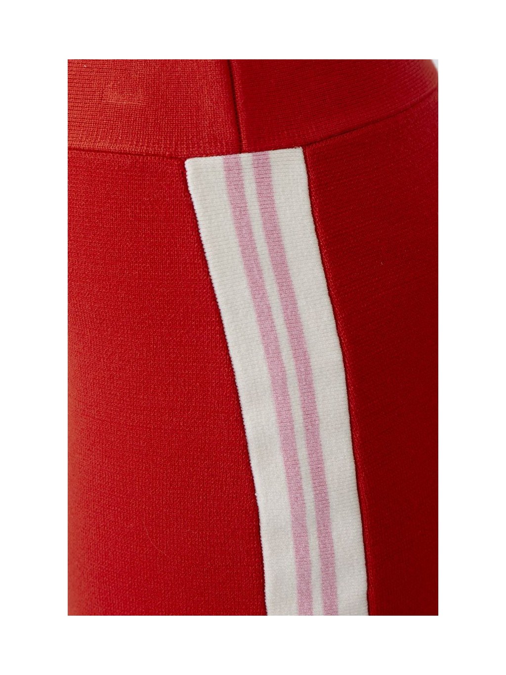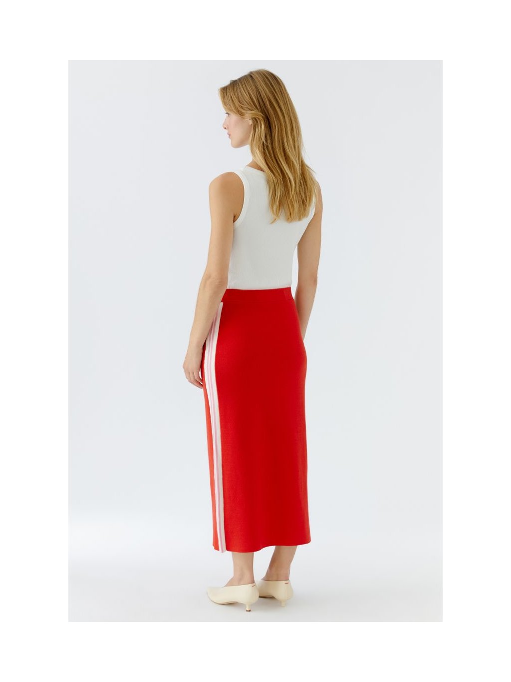 Červená pletená sukně OUI s bočními bílorůžovými lampasy.
