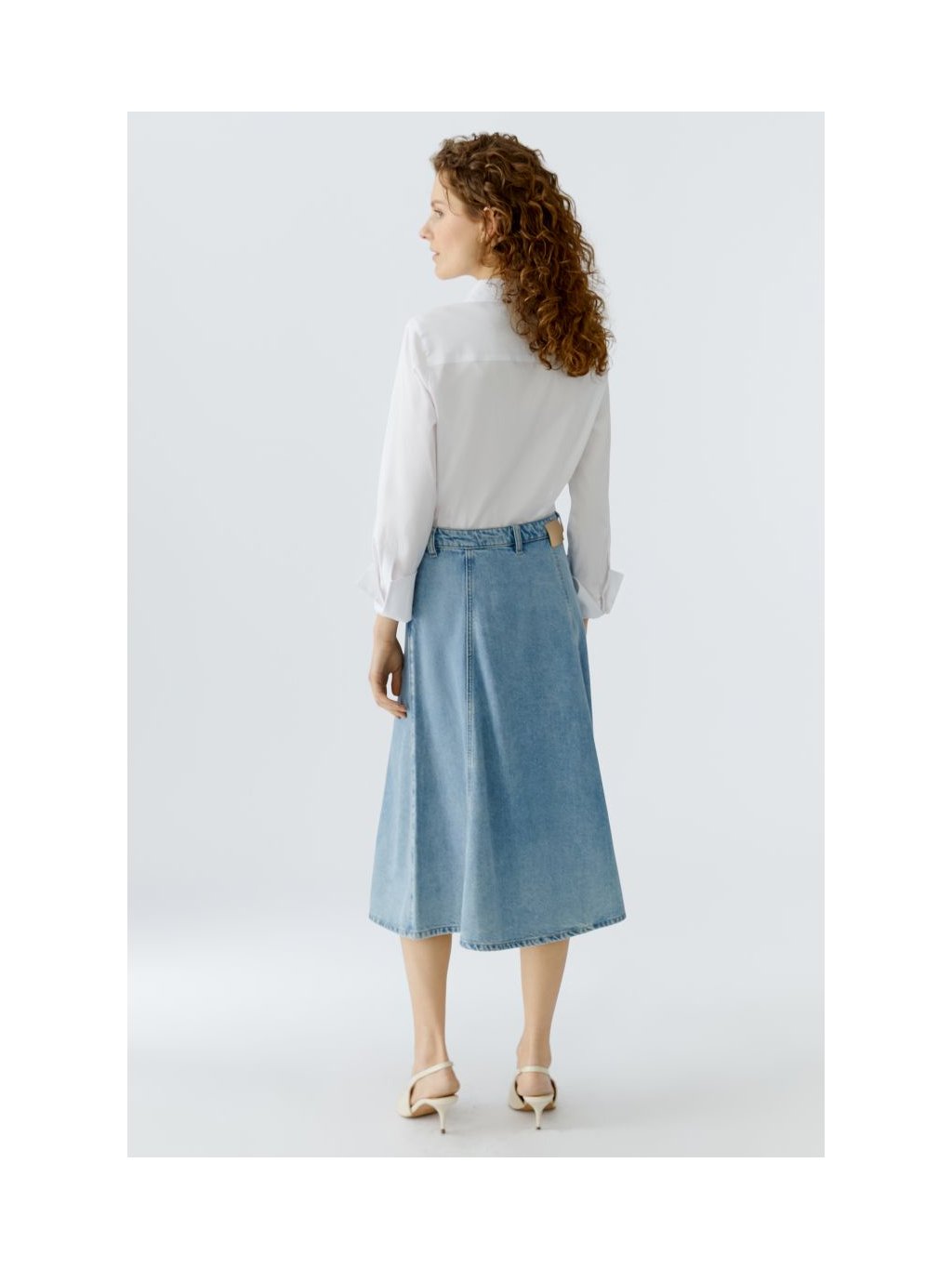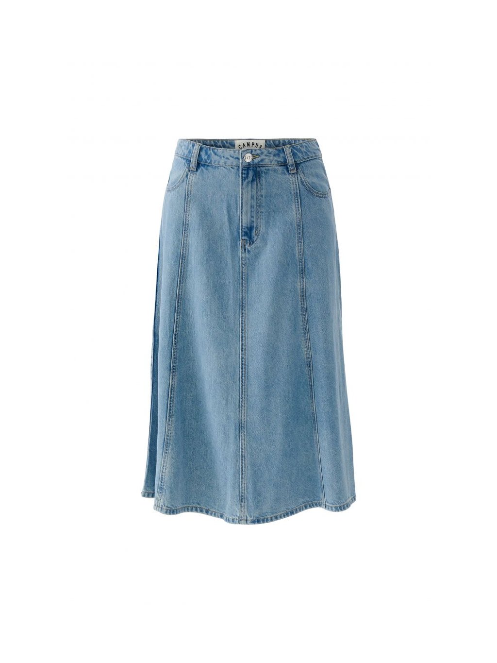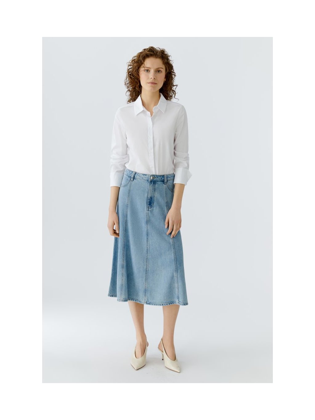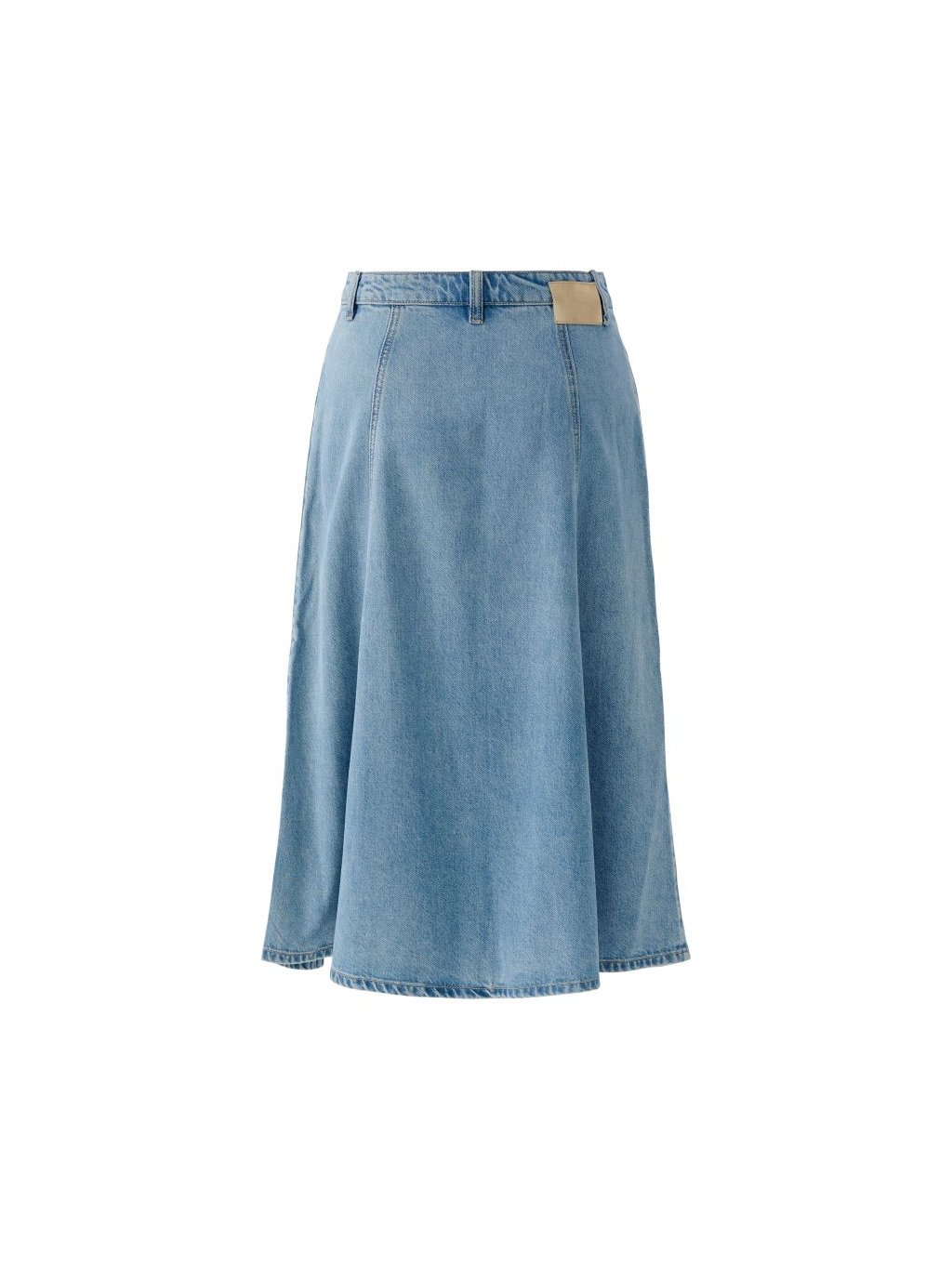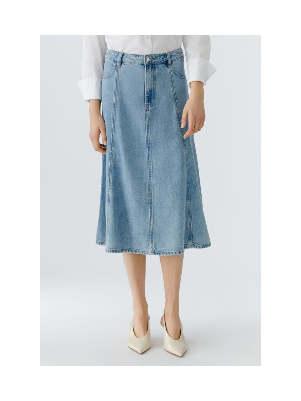 Džínová sukně na míru, rozšířená na midi délku, s panelovým střihem