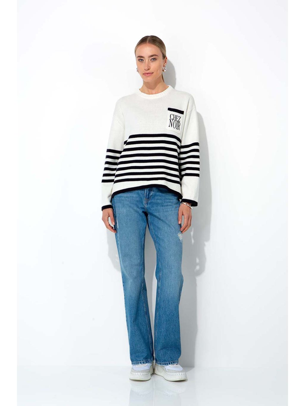 Bavlněný svetr s modrým pruhem. Kapsa s nápisem, dlouhý rukáv.