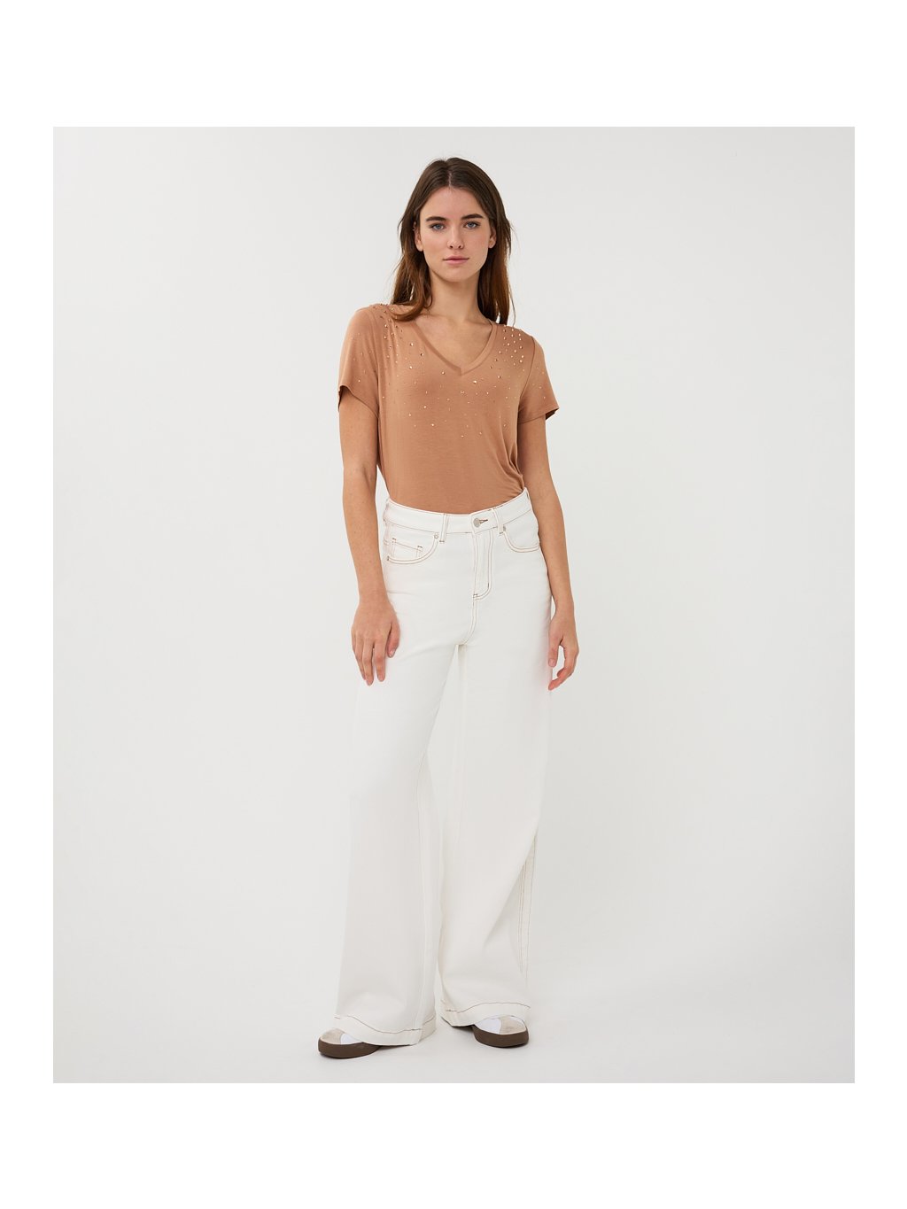 Viskózové triko s kamínky v barvě trika, výstřih do V.