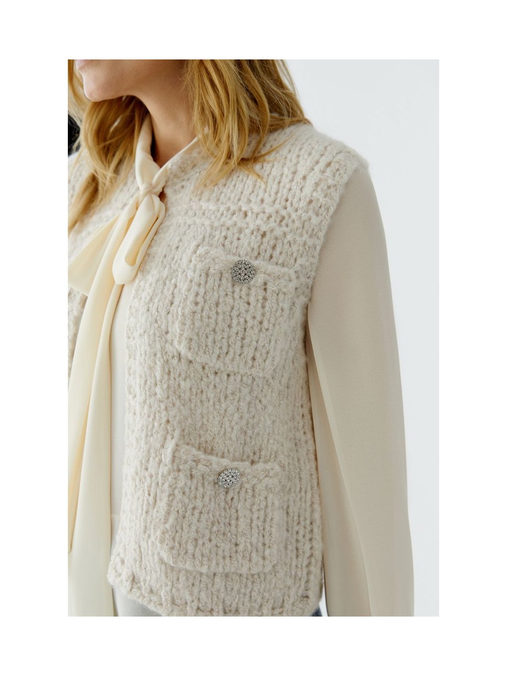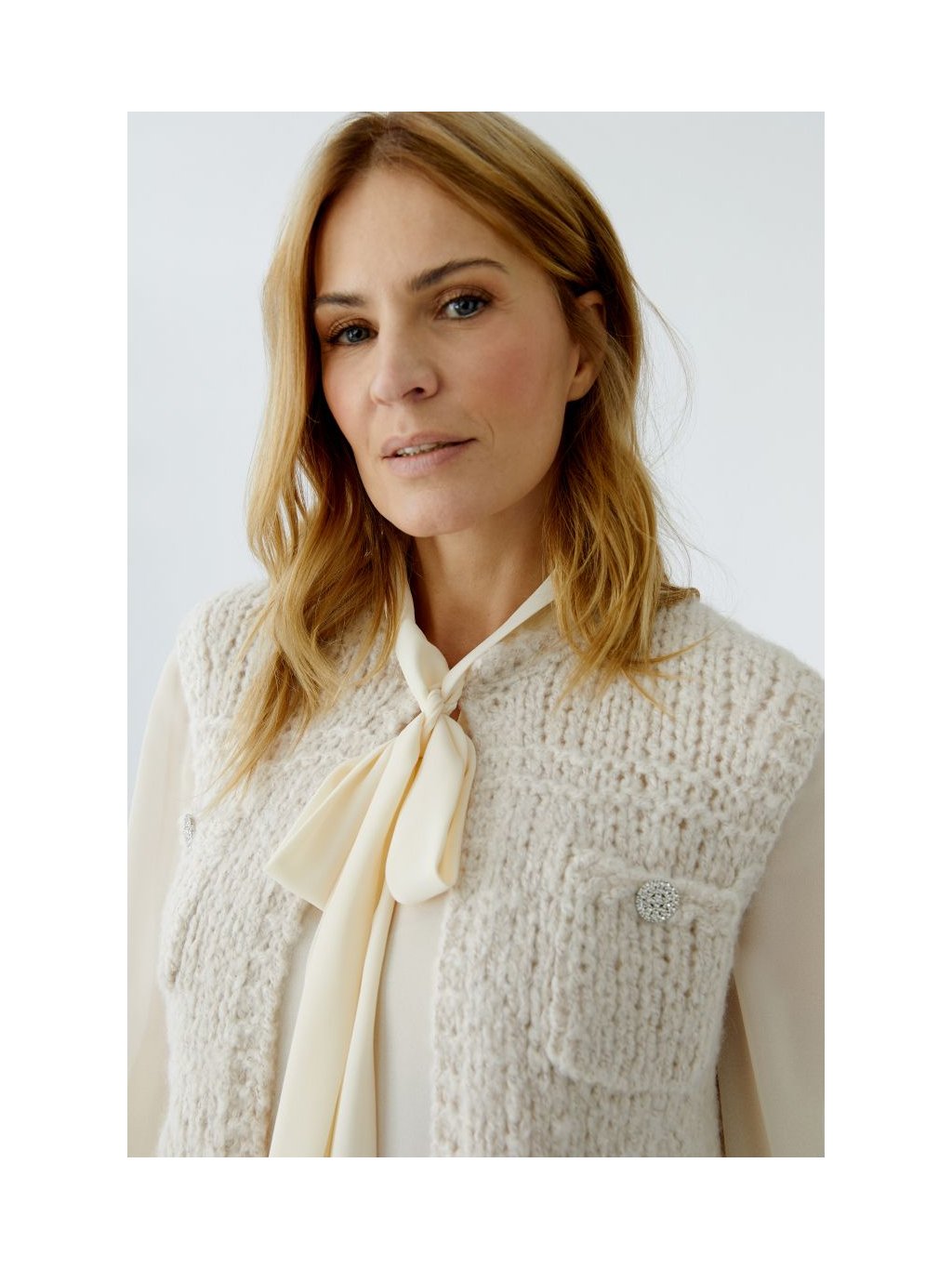 Pozvedněte svůj každodenní šatník touto krásně vyrobenou pletenou vestou ve světle béžové melanžové barvě. Díky klasickému zapínání na knoflíky je to perfektní kousek na vrstvení, který se plynule mění z sezóny na sezónu. Měkká, luxusní pletenina elegantně splývá s vaší pokožkou a nabízí pohodlí i sofistikovanost. Oblečte si ji přes svěží bílou košili pro elegantní kancelářský outfit nebo ji zkombinujte s jednoduchým tričkem pro uvolněnou víkendovou atmosféru. Tato všestranná vesta, nadčasový nezbytný kousek, který funguje lépe, než vypadá, si zaslouží trvalé místo ve vašem šatníku.